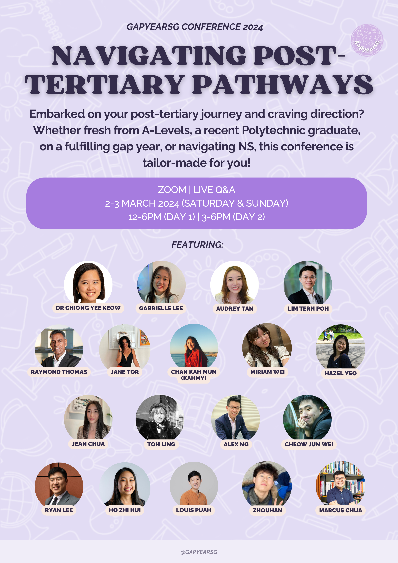 Being the chief designer for the GapYearSG Conference, I was tasked to design a promotional poster, zoom background templates for the speakers, and instagram posts to market the conference and give insights about the speakers to the audience.
